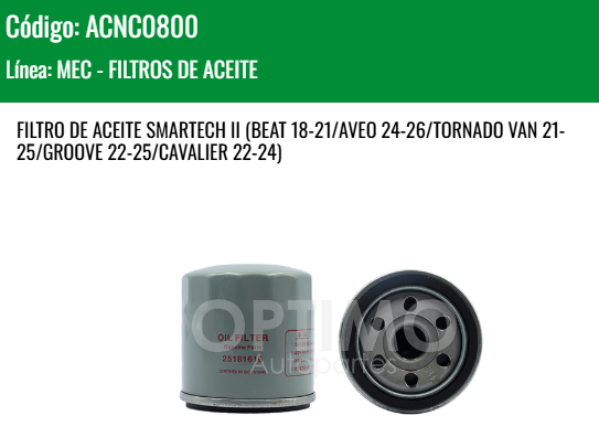 YOKOMITSU ACNC0800 FILTRO DE ACEITE CHEVROLET BEAT 18-21 AVEO 24-26 TORNADO VAN 21-25 GROOVE 22-25 CAVALIER 22-24