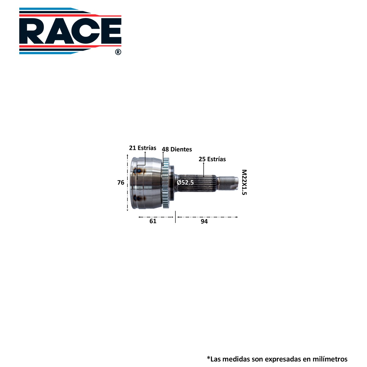 RACE RR-9500 BALERO ESPIGA LADO RUEDA DER/IZQ HYUNDAI GRAND I10 1.2L 1.3L C/ABS 15-20 INT 21D EXT 25D TRANSM. AUT-STD